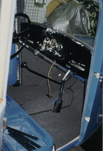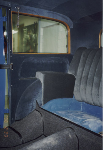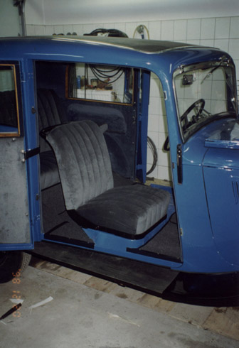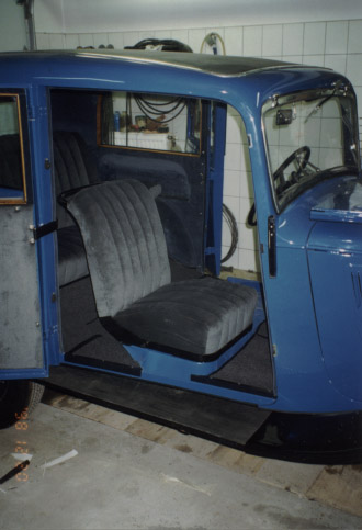 A belső teret igyekeztem korabeli anyagokból elkészíteni. Az oldalfalak velur az ülések epinglé huzatot kaptak.